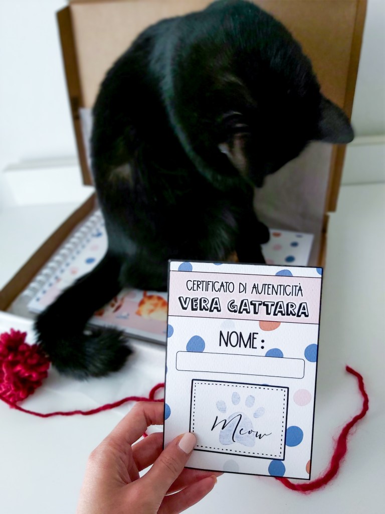 Insieme al tuo album riceverai anche il certificato di autenticità di vera gattara e un giochino fatto a mano per ognuno dei tuoi gatti.
